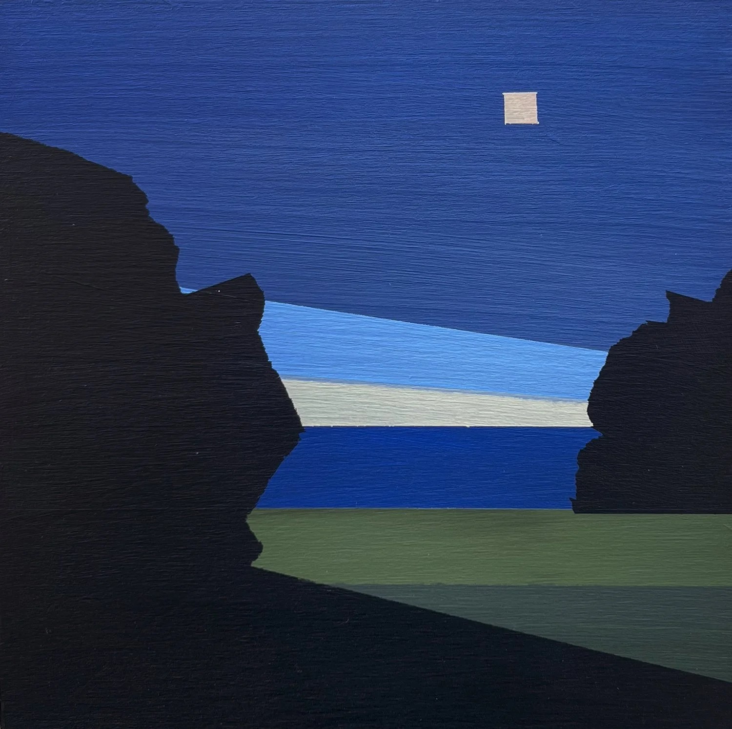 Greta Van Campen distills the world around her into prismatic, clean-edged images that visually thrum with clear notes of color. Reducing still life and landscape elements to essential forms, she pictures nature and domesticity as ordered arrangements of flat, abstracted shapes. Ocean and sky radiate from the horizon as swathes of fractured color or raking triangles of light. Islands, mountains, and trees appear as silhouettes, anchoring the expanse of land and sea.